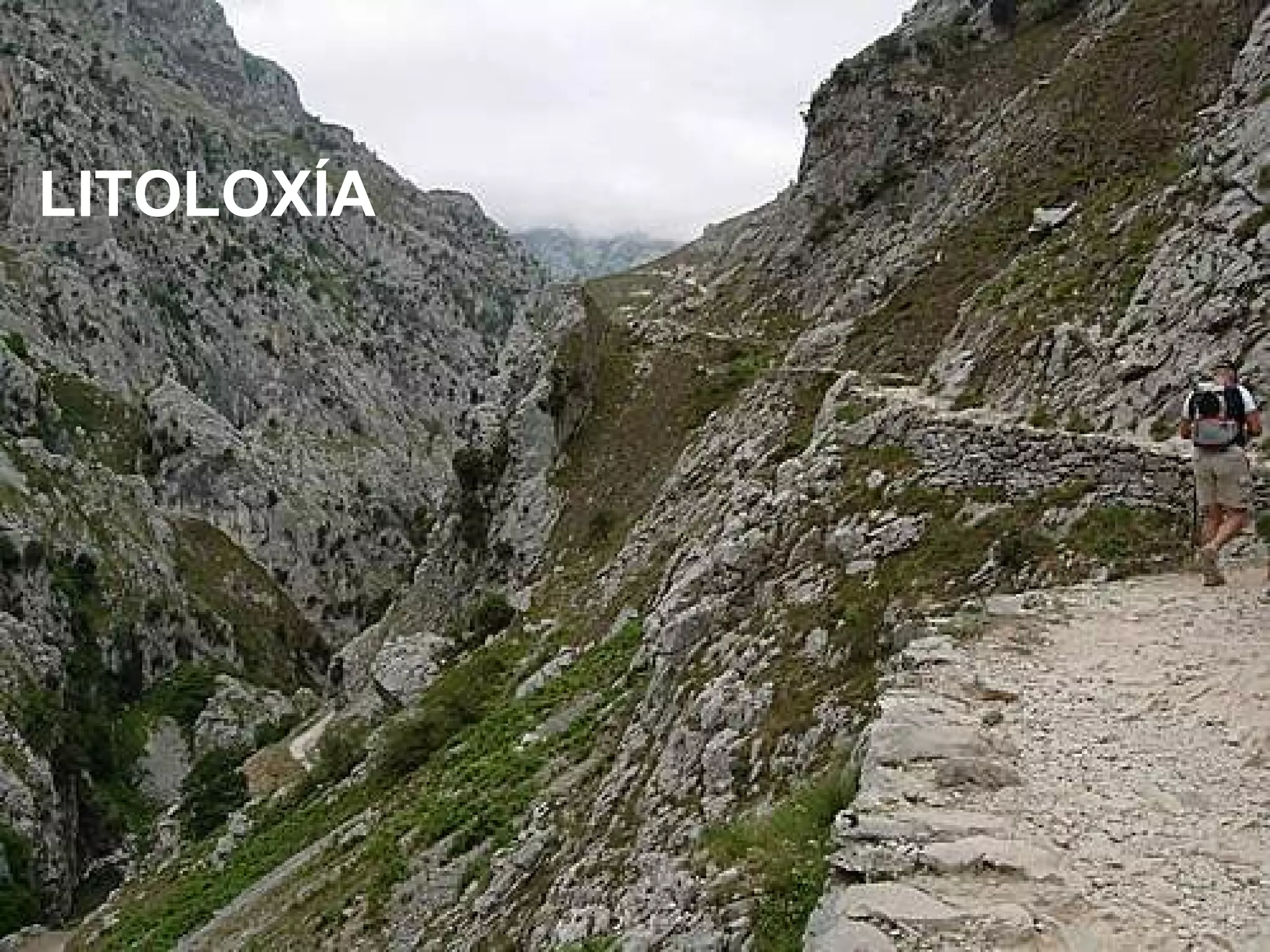 A ESPAÑA CALCARIAFormadas por sedimentos marinos da era secundaria plegados durante o terciario. Localízanse seguindo unha Z invertida :Prepirineos, Montes Vascos, o sector oriental da Cordilleira Cantábrica, o Sistema Ibérico, parte da Cordilleira Costeiro-Catalana e a Cordilleira Subbética A rocha predominante é a Calcaria , rocha dura que se fractura formando grietas o diáclases, pero que se disolve fácilmente coa auga de choiva, dando lugar ó relevo karstico , cuxas formas son: Lapiás ou lenares na superficie, ben sexan surcos ou xa formen cavidades. Gargantas ou foces (canóns) (vales estreitos e profundos escavados polos ríos) Dolina pequena depresión de fondo horizontal. Cando se unen varias dolinas fórmase unha uvala. Cando a depresión é máis grande fórmase un polxé - (véxase máis adiante) Covas: Cando se infiltra o auga polas fisuras e circula de forma soterránea vai excavando covas, nas que pode depositarse a caliza disolta en forma de estalactitas (colgantes do teito), estalagmitas (depositada no solo) ou columnas cuando se unen ambas. Simas : aberturas estreitas que comunican a superficie coas galerías soterráneas.