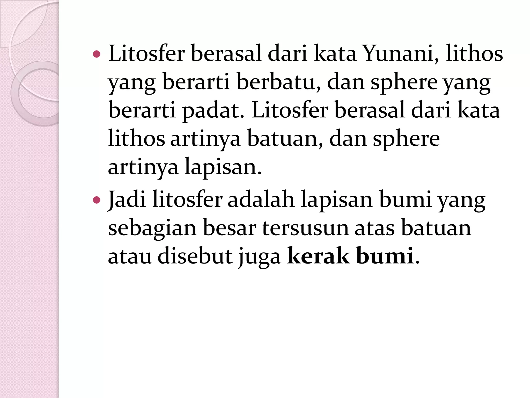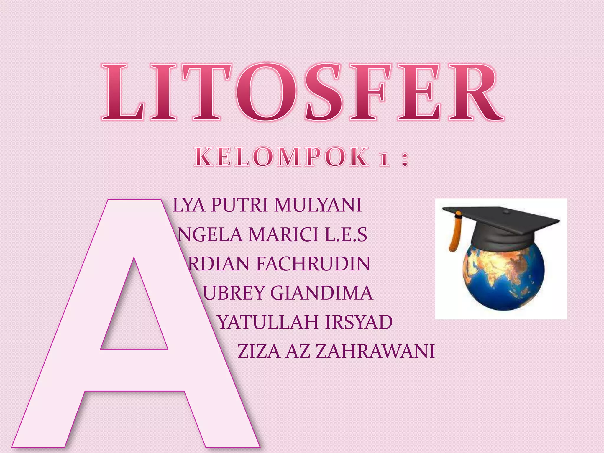 Dokumen tersebut membahas tentang litosfer, yaitu lapisan terluar bumi yang terdiri dari batuan dan kerak bumi. Litosfer terbentuk dari unsur oksigen, silikon, dan aluminium. Terdapat dua jenis litosfer yakni litosfer benua dan litosfer samudra yang memiliki kedalaman berbeda. Bentuk permukaan bumi antara lain dataran rendah, tinggi, lembah, bukit, dan gunung. Proses yang terjadi pada litosfer