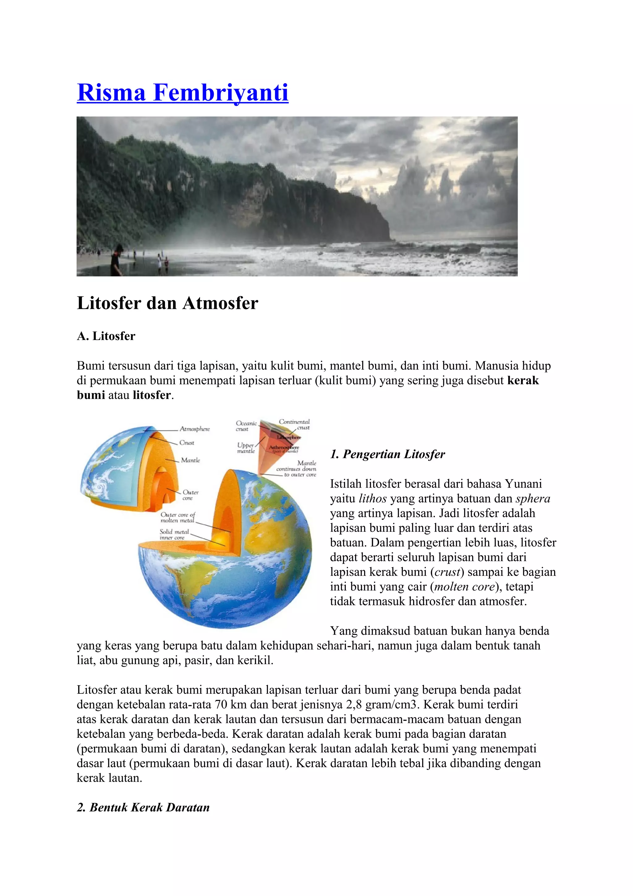 Dokumen membahas litosfer Bumi yang terdiri dari tiga lapisan: kulit Bumi, mantel, dan inti, dengan fokus pada pembentukan berbagai jenis batuan dan proses geologis. Terdapat juga penjelasan mengenai tenaga endogen seperti tektonisme dan vulkanisme serta tenaga eksogen yang mengubah bentuk permukaan Bumi melalui pelapukan, erosi, dan sedimentasi. Dampak dari proses-proses ini dapat bersifat positif, seperti peningkatan kesuburan tanah, atau negatif, seperti bencana alam.