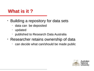 The ANU data commons is building a repository for research data sets that allows researchers to deposit, update, and publish their data while retaining ownership. The repository is based on Fedora Commons and provides a web interface and command line tool for uploading data, with storage and backup provided through the ANU's infrastructure. It will launch in closed beta on July 13 and open beta on September 4, with the goal of populating the commons by auditing existing data sets and encouraging uploads from researchers.