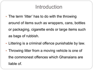 This document discusses litter prevention in Ghana. It notes that littering is a common illegal offense and plastic waste from "sachet" water is a major component of municipal solid waste. Recycling plastic waste could generate over $200,000 per month for Ghana's economy. It recommends a waste management hierarchy of reducing, reusing, recycling, and composting waste before disposal in landfills. Specific tips are provided to reduce waste and promote recycling including avoiding excess packaging and using reusable products.