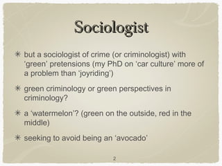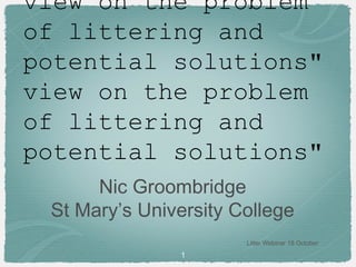 The document discusses the problem of littering from a criminological perspective, highlighting how it is often dismissed despite being a volume crime. It critiques existing criminological frameworks for overlooking environmental harms and suggests that littering should be treated as a serious issue that merits inclusion in criminology, particularly green criminology. The document advocates for better community engagement and more practical solutions to address litter, emphasizing the need for societal accountability rather than solely blaming individuals.