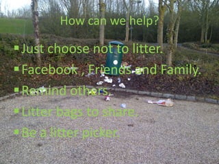 The document discusses the problems caused by litter and ways to help reduce littering. It notes that litter poisons the planet, kills animals, costs taxpayers, and lowers property values while also endangering personal safety and causing fires and accidents. Some solutions proposed include not littering, reminding others not to litter, sharing litter bags, and picking up litter. The overall message is that litter has many negative consequences but its impact can be reduced through individual and community action.