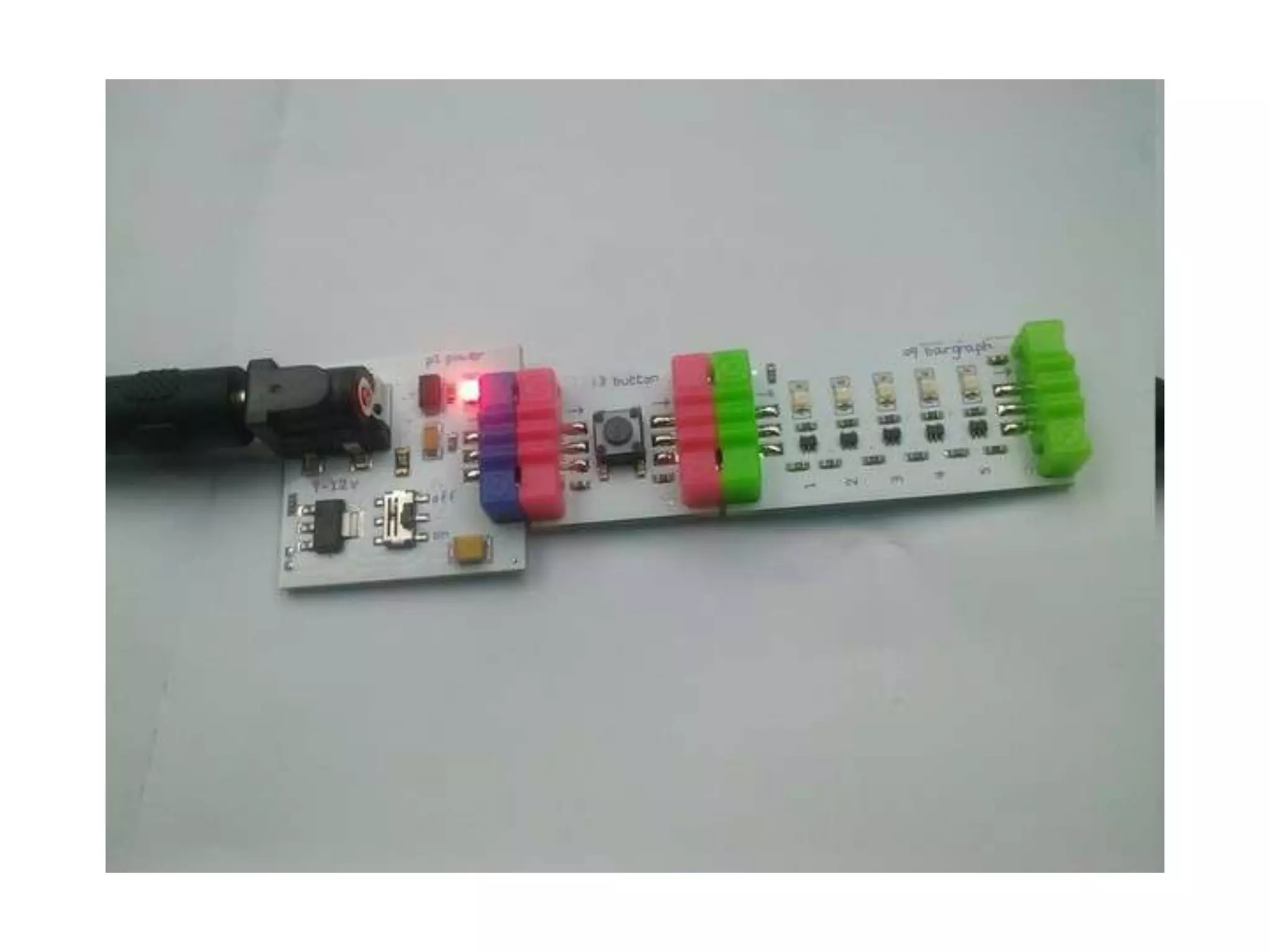 #8 Construct this circuit with Power + Pressure + Bargraph. Press the pressure sensor and what do you see? If you want the Bargraph to show maximum 3 lights, what do you need to add? If you want thebargraph to flash every second, what to do? Can you think of an invention that uses this circuit?