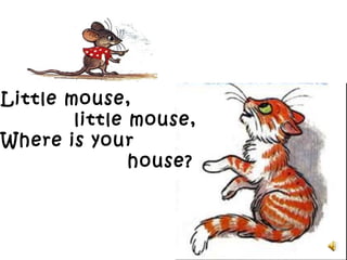 This short story is about a little cat asking a little mouse where its house is. The mouse responds that it does not have a house since it is a poor mouse. The cat then invites the mouse into its house, but the mouse refuses, knowing that the cat wants to eat it.