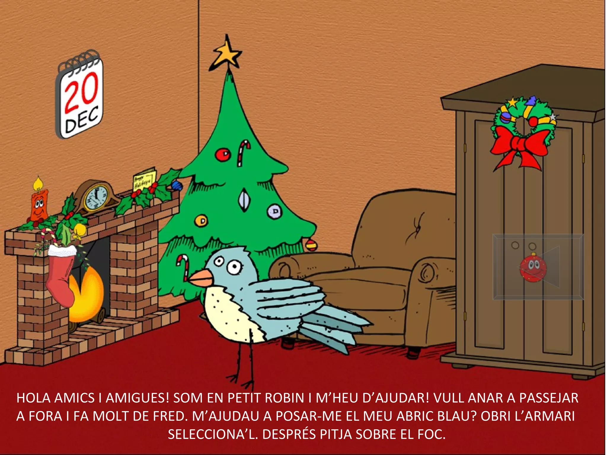 Little robin 1. 2. HOLA AMICS I AMIGUES! SOM EN PETIT ROBIN I M’HEU D’AJUDAR! VULL ANAR A PASSEJAR A FORA I FA MOLT DE FRED. M’AJUDAU A POSAR-ME EL MEU ABRIC BLAU? OBRI L’ARMARI I SELECCIONA’L. DESPRÉS PITJA SOBRE EL FOC. 3. 4. JA ESTIC PREPARAT PER ANAR A PASSEJAR. PITJA SOBRE EL FOC I ACOMPANYA’M A FER UNA VOLTETA. 5. 6. LITTLE ROBIN Pitja damunt l’ocellet per tornar a començar el conte. Pitja damunt la flor groga per començar l’activitat. 7. ACTIVITAT Contesta les següents preguntes: - Quin és el nom de l’ocellet de la història? - On té guardat l’abric? - Quin color és l’abric que tria per posar-se? - Per què es vol posar l’abric?