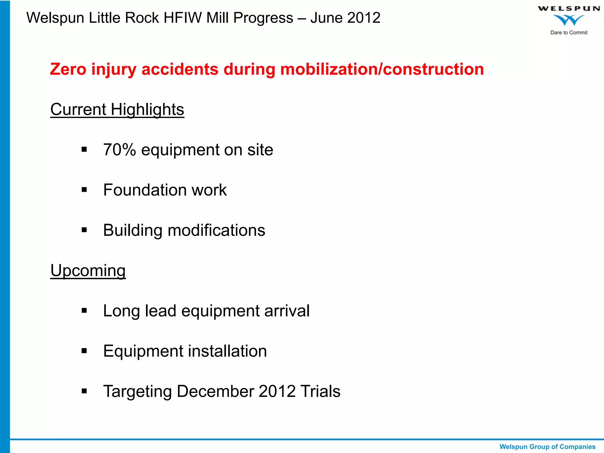 The Welspun Little Rock HFIW Mill project has had no injuries so far during mobilization and construction. 70% of equipment is now on site and foundations are being worked on while building modifications are underway. Long lead equipment will arrive soon followed by installation as the target date for trials is December 2012.