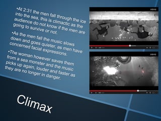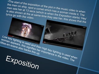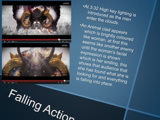 The video follows the typical narrative arc of rising action, climax, and resolution. It begins in black and white but colors appear when the men meet the women. The men and women take a flying ship and zip line to a cave, pursuing something unknown. Ultimately, the woman finds her place on a bird-like throne, signaling she has returned home and the men are honored for helping her get there, shown through bright colors at the end.