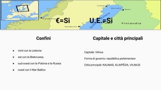 La Lituania è una repubblica parlamentare con capitale Vilnius, situata al confine con Lettonia, Bielorussia, Polonia, Russia e il Mar Baltico. La sua economia ha subito un cambiamento significativo dopo la transizione verso il capitalismo, con settori chiave come agricoltura, industria e turismo. Un noto sito culturale è la Collina delle Croci, un importante luogo di culto con oltre 200.000 croci, patrimonio dell'umanità UNESCO.