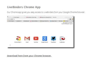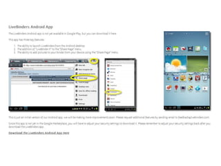 This document provides information about using LiveBinders to create electronic portfolios (ePortfolios) to document teaching artifacts based on the Danielson Framework for Teaching. It explains that LiveBinders allows teachers to construct paperless portfolios by organizing artifacts online. It then provides step-by-step instructions for setting up a LiveBinder account and template, and includes links to tutorials and examples of ePortfolios built on the Danielson Framework. Additional online tools and resources for creating images, videos and housing documents are also listed.