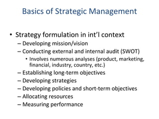 Dole Foods is considering international expansion and must make several strategic decisions. It must determine which foreign markets to enter, when to enter them, how much resources to commit initially, and how to enter through options like exporting, licensing, joint ventures, or wholly owned subsidiaries. Key factors in these decisions include advantages and risks of early vs late entry, pressures for low costs vs local responsiveness, and whether to make or buy component parts through strategic alliances.