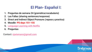 This document provides an overview of a Spanish class covering direct and indirect object pronouns. It includes: