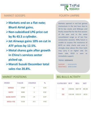 On January 2, 2015, Indian markets opened lower but gained momentum towards the end, influenced by oil, gas stocks, and midcaps, resulting in a flat close. Key resistance for Nifty is at 8370, with immediate support at 8310, and market activity includes gains by Bharti Airtel and Jet Airways following price adjustments. Overall, the market trend remains sideways with notable movements in metal shares due to China's services sector growth.