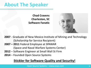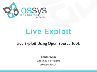 The document discusses a live exploit demonstration using open source tools. It introduces the speaker and their background and company. It then outlines the basic steps of an attack including network reconnaissance using Nmap to map IPs and services, targeting vulnerable services, using Metasploit to find and run exploits to gain privileges and install backdoors, and using additional tools like Shodan and Google searches to find more information. It concludes by providing additional training resources.