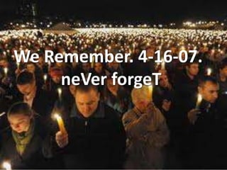 This document provides memorial tributes and remembrances of 32 individuals who lost their lives in the April 16, 2007 shooting at Virginia Tech. The tributes describe the victims as kind, compassionate people who were deeply loved by their families and friends. They highlight each person's positive attributes, character strengths, and the ways they brought joy and made a difference in the lives of others. The document conveys the enduring legacies of each victim and ensures they will never be forgotten.
