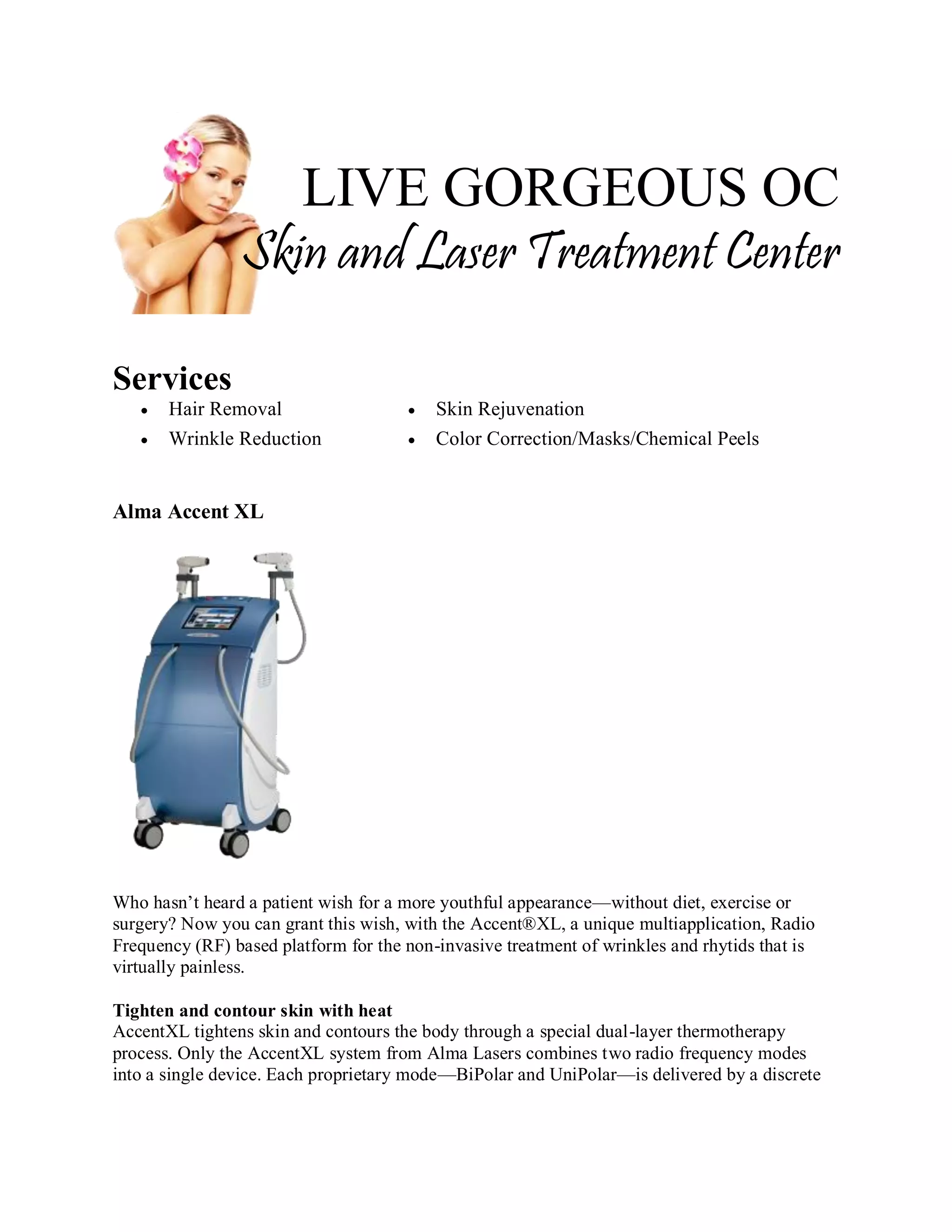 Live Gorgeous OC offers a variety of non-invasive skin and laser treatments including hair removal, wrinkle reduction, and skin rejuvenation. Utilizing advanced technologies like Accent XL and Venus Freeze, they provide effective solutions for achieving youthful, firm skin without surgery or significant downtime. The center also offers specialized treatments like the Triniti Skin Series and Radiesse fillers for enhancing skin texture and volume.