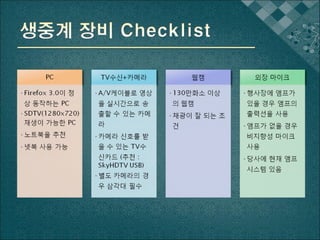 생중계에 2인 이상의 인력이 투입될 수 있는가 ? ( 카메라 / 콘솔 교대인력 ) 행사장의 넓이가 카메라 1 대로 커버 가능한가 ? PC 와 PC 의 케이블은 사람들이 잘 다니지 않는 곳으로 치워져 있는가 ?
