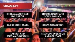 Live Nation plans to expand into South America by acquiring T4F, Brazil and Chile's largest entertainment company. T4F owns 5 venues in Brazil and 1 in Argentina and has a network of over 2.3 million fans. However, T4F is struggling financially and their stock has dropped 85% since going public. Live Nation's acquisition of T4F for $190 million would allow them to gain a foothold in South America and leverage T4F's expertise and infrastructure to grow live entertainment in the region over the next 4-6 years.