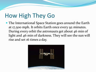 The International Space Station orbits Earth every 92 minutes at a speed of 17,500 mph. It has 5 major parts including solar arrays, a science lab, command center, habitat, and docking port. Astronauts follow a daily schedule that includes exercise, meal times, science experiments, and sleep. They train underwater and receive supplies from resupply spacecraft. Various experiments are conducted on the ISS, including growing plants and microgravity experiments. Astronauts must exercise daily to prevent muscle and bone loss in the microgravity environment. They sleep in attached sleeping bags and wear comfortable, reusable clothes.