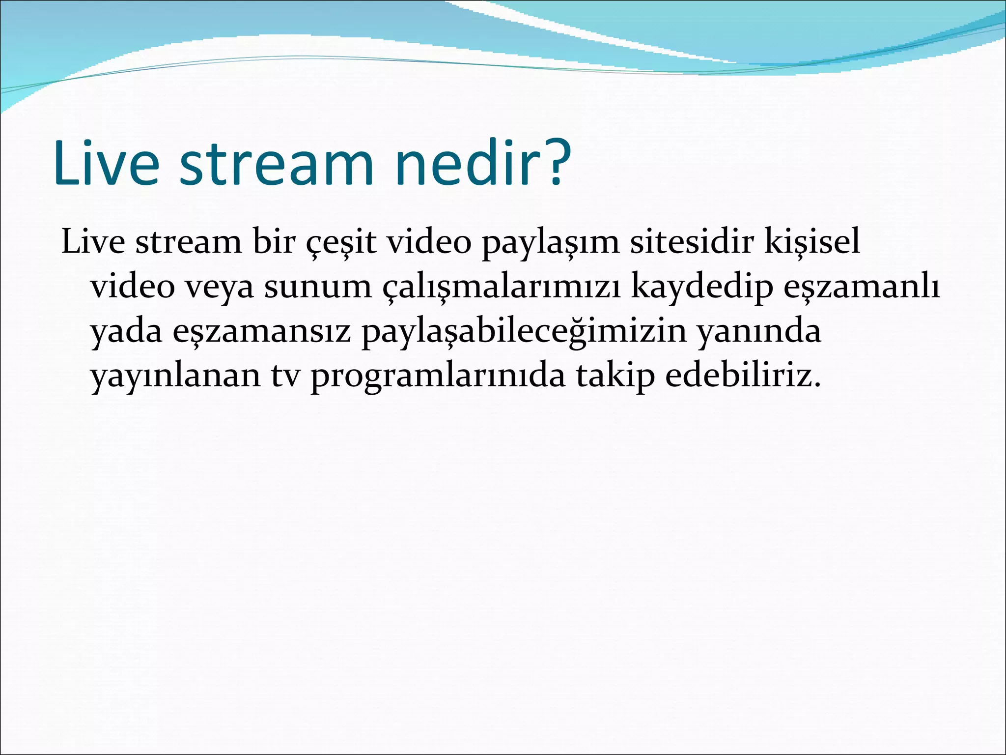 Live stream nedir?Live stream bir çeşit video paylaşım sitesidir kişisel video veya sunum çalışmalarımızı kaydedip eşzamanlı yada eşzamansız paylaşabileceğimizin yanında yayınlanan tv programlarınıda takip edebiliriz.