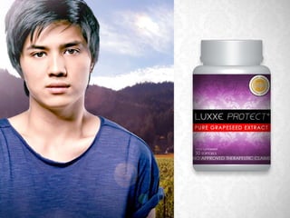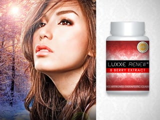 This document discusses the health benefits of various fruits and supplements. It describes how berries like acai, pomegranate, noni, cranberry, goji, mangosteen, blackberry and blueberry contain high levels of antioxidants and can help prevent cancer, heart disease, and other conditions. It also outlines the benefits of supplements like enhanced glutathione, L-carnitine, green tea extract and their roles in detoxification, energy production, and reducing health risks. Finally, it advertises a Luxxe White package that combines glutathione and grape seed extract capsules at a discounted price.
