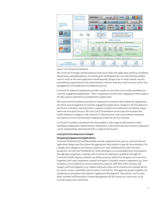 LiveCycle Enterprise Suite (ES) provides a service-oriented architecture that allows organizations to quickly develop customer engagement applications. It exposes back-end processes as loosely coupled services that can be assembled into solutions. LiveCycle ES supports various user interface technologies and development tools to build rich, engaging applications. It also provides a common runtime environment and centralized administration tools to simplify deployment and management of applications.