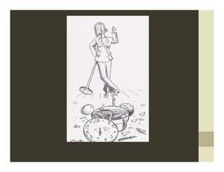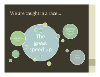 The document discusses different perspectives on time and how our relationship with time can impact our well-being. It notes that clock time is a human construct that fragments our experience of lived time connected to our senses and rhythms. Our ideas about lack of time and need for efficiency can negatively impact our mental state. It suggests practicing mindfulness of time through attention exercises and being open to inefficiencies to improve our relationship with time.