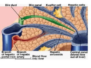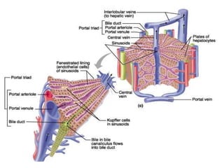 The liver is the largest gland in the body, located in the upper right quadrant of the abdomen under the diaphragm and within the rib cage. It has four lobes - two major lobes and two minor lobes - and ducts that carry bile from the liver to the gallbladder and join the pancreatic duct. The liver is made up of lobules containing hepatocytes that radiate outward from a central vein and produce and secrete bile. Blood flows to the liver through the hepatic portal vein and supplies the liver with nutrients and oxygen. The liver performs many important metabolic functions like synthesizing and breaking down substances, and excreting waste from the bloodstream into bile.