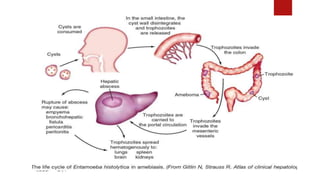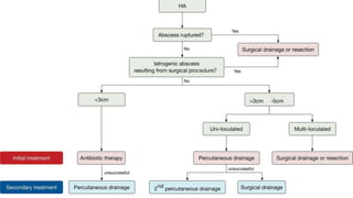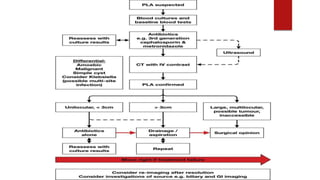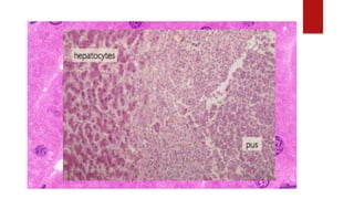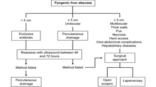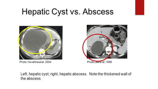 The document presents two case studies of liver abscesses in patients, detailing symptoms, laboratory findings, and imaging results. It outlines the definition, epidemiology, risk factors, classifications, and management of liver abscesses, which can be caused by various agents including bacteria and amoebae. Emergency and surgical interventions, alongside antibiotic treatments, are necessary for effective management of liver abscesses, particularly for severe or complicated cases.