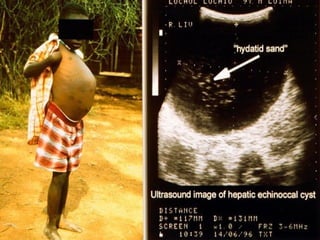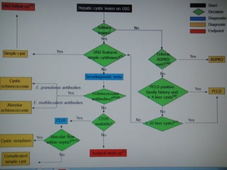 The document provides an in-depth discussion on liver cysts, including their classification, types, and personal case studies dealing with hydatid cysts. It covers salient features, complications, and recent advances in treatment options while emphasizing the need for standardized approaches. Key points highlighted include the challenges in diagnosis and management as well as the incidence of various types of cysts across different specialties.