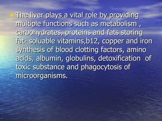 The liver plays a vital role in many metabolic functions, but can fail due to disease, toxicity, or other stress factors. Early liver failure involves inflammation and scarring of the liver tissue, while advanced failure occurs when compensatory mechanisms are overwhelmed and toxic substances build up. Acute liver failure has many potential causes including viral hepatitis, toxic drugs, and shock. Medical tests like bloodwork and imaging can help identify the underlying cause and extent of damage. Key nursing priorities include monitoring for complications like fluid imbalance and hepatic encephalopathy. Treatment focuses on supportive care, dietary modifications, and addressing any underlying triggers.