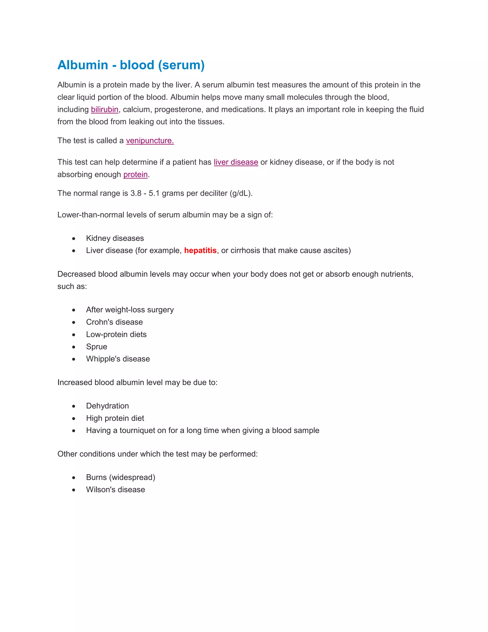 - Albumin measures the protein made by the liver to transport molecules through the blood. Abnormal levels may indicate liver or kidney disease.