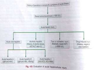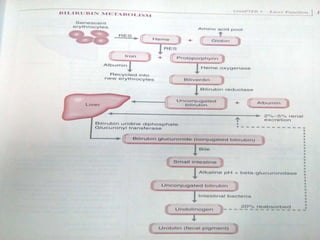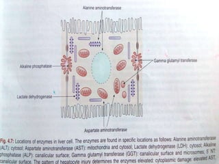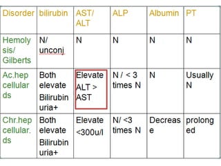 Liver function tests can detect, distinguish, and monitor various types of liver disease. Tests are grouped based on the liver's excretory, metabolic, detoxification, storage and synthetic functions. Enzyme tests like ALT and AST indicate hepatocyte damage, while elevated ALP and GGT suggest cholestasis. Protein tests such as albumin, PT and AFP evaluate synthetic function. Bilirubin, bile salts and dye excretion tests examine excretory function. Together these tests provide insight into liver health and disease categories.