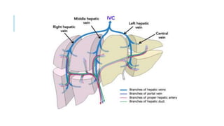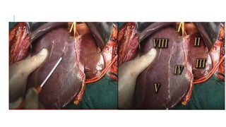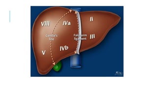 The document discusses anatomical and surgical classifications of liver segments, highlighting limitations in using the falciform ligament for division. It details the Cantlie line and Couinaud's classification, emphasizing vascular supply for segment differentiation, and explains the role of hepatic veins in segment drainage. Important landmarks for CT scan classification of the liver are also described, including the relationship of the caudate lobe, gall bladder, and liver fissures.