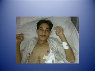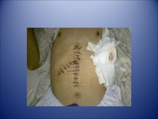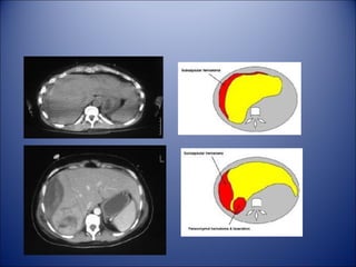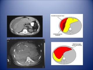 This document presents a case of traumatic liver injury in a 17-year old male patient who was in a motorcycle accident. He presented with abdominal pain and vomiting. Imaging showed a liver laceration and bleeding in the abdomen. He underwent an exploratory laparotomy where a left lobe liver laceration and diaphragm perforation were found and repaired. He recovered well after surgery with drain removal after one week and was discharged. Traumatic liver injuries can range from minor injuries treated non-operatively to severe injuries requiring surgery like lobectomy or packing to control bleeding. Both non-operative and surgical management were discussed.