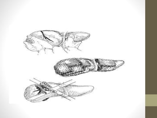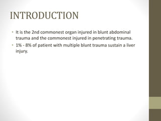 3) Liver injuries are classified based on the mechanism of injury, type and degree of damage, localization within liver lobes/segments, and whether associated vessels or bile ducts are damaged. Grades I-II are minor injuries while Grades III-V require surgical intervention and Grade VI is incompatible with survival.
