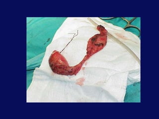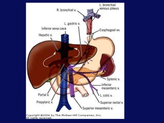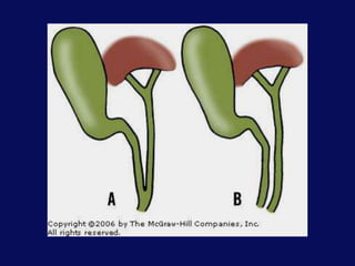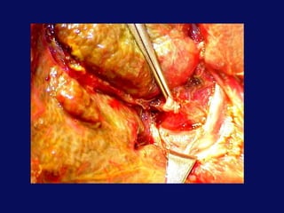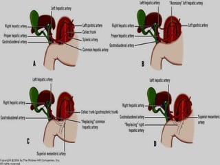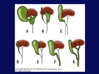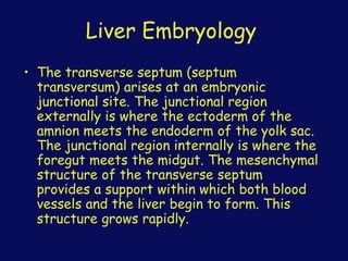This document discusses the surgical anatomy of the liver and biliary tree. It begins with a description of liver embryology, including how the hepatic diverticulum and primordium form from the transverse septum and later differentiate into the mature liver and gallbladder. It then discusses the development of the biliary duct system and liver parenchyma. Key surgical landmarks, vasculature, variations, anomalies, and pathological conditions of the biliary tract are outlined, including biliary atresia and choledochal cysts. The classifications, diagnoses, and surgical treatments of these conditions are summarized.