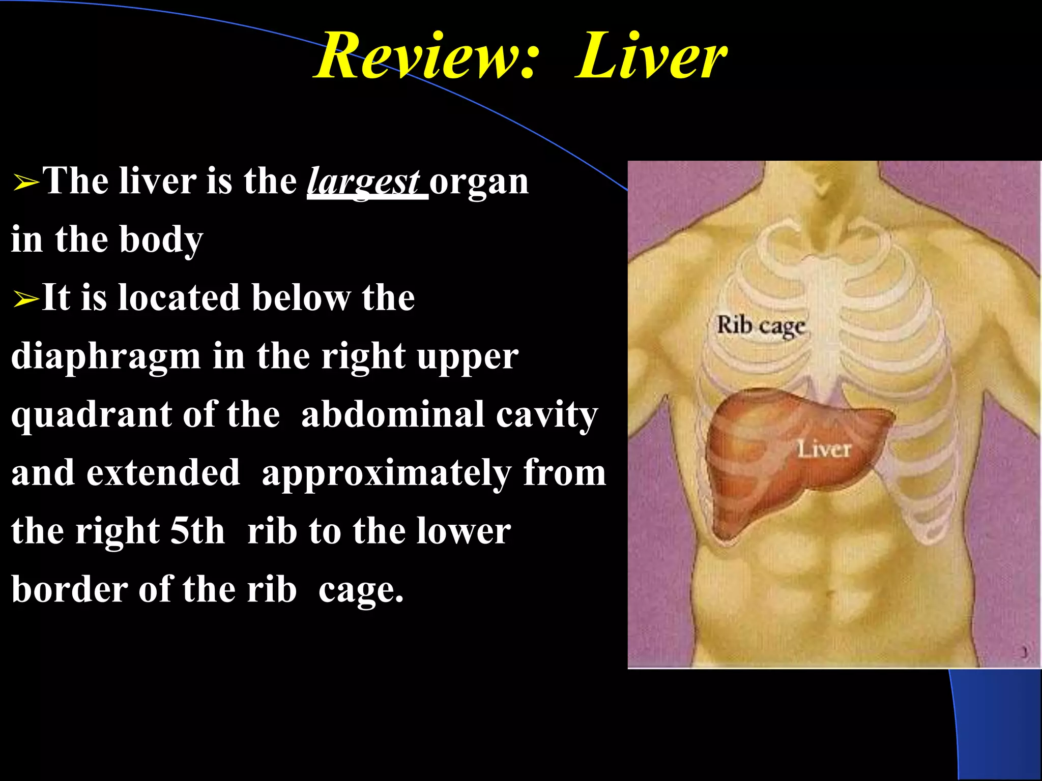 The liver is the largest organ located in the right upper quadrant of the abdominal cavity. It performs many vital functions including excretion, metabolism, hematological functions, storage, detoxification, and protein synthesis. Liver function tests (LFTs) evaluate the liver's ability to function properly through measurements of enzymes and proteins in blood and urine samples. Elevated levels of certain enzymes and proteins can indicate liver inflammation, injury, or disease. LFTs help physicians diagnose conditions affecting the liver such as viral hepatitis, cirrhosis, cancer, or blockages of the bile ducts.