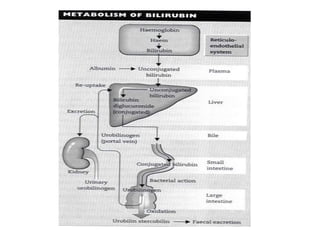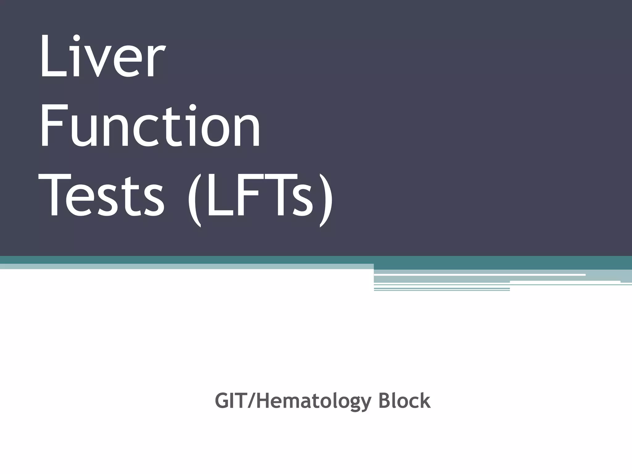 The document discusses liver function tests (LFTs), which are used to screen for and diagnose liver dysfunction. It outlines the major metabolic functions of the liver, causes of liver disease, and various markers that can be measured in LFTs to detect hepatic injury and assess liver function. These include liver enzymes, bilirubin, albumin, prothrombin time, alkaline phosphatase, and gamma-glutamyltransferase. The document explains what each marker indicates and the typical ranges seen in different types of liver disease. LFTs have limitations but can help identify the general type of liver disorder and monitor disease severity and treatment response.
