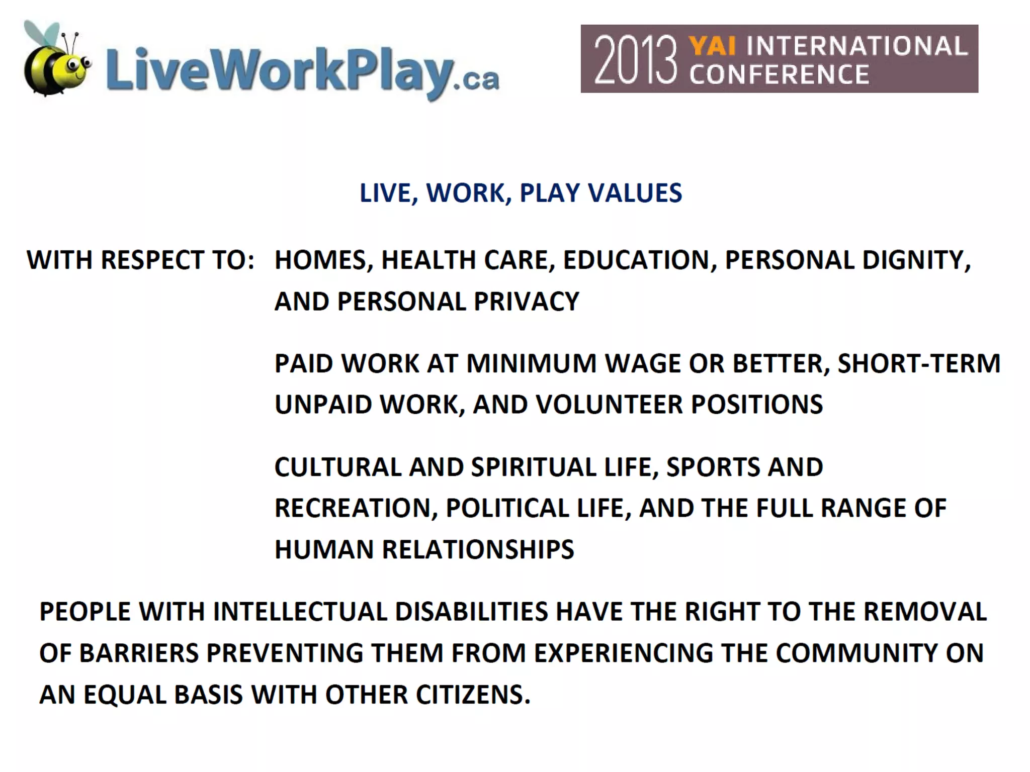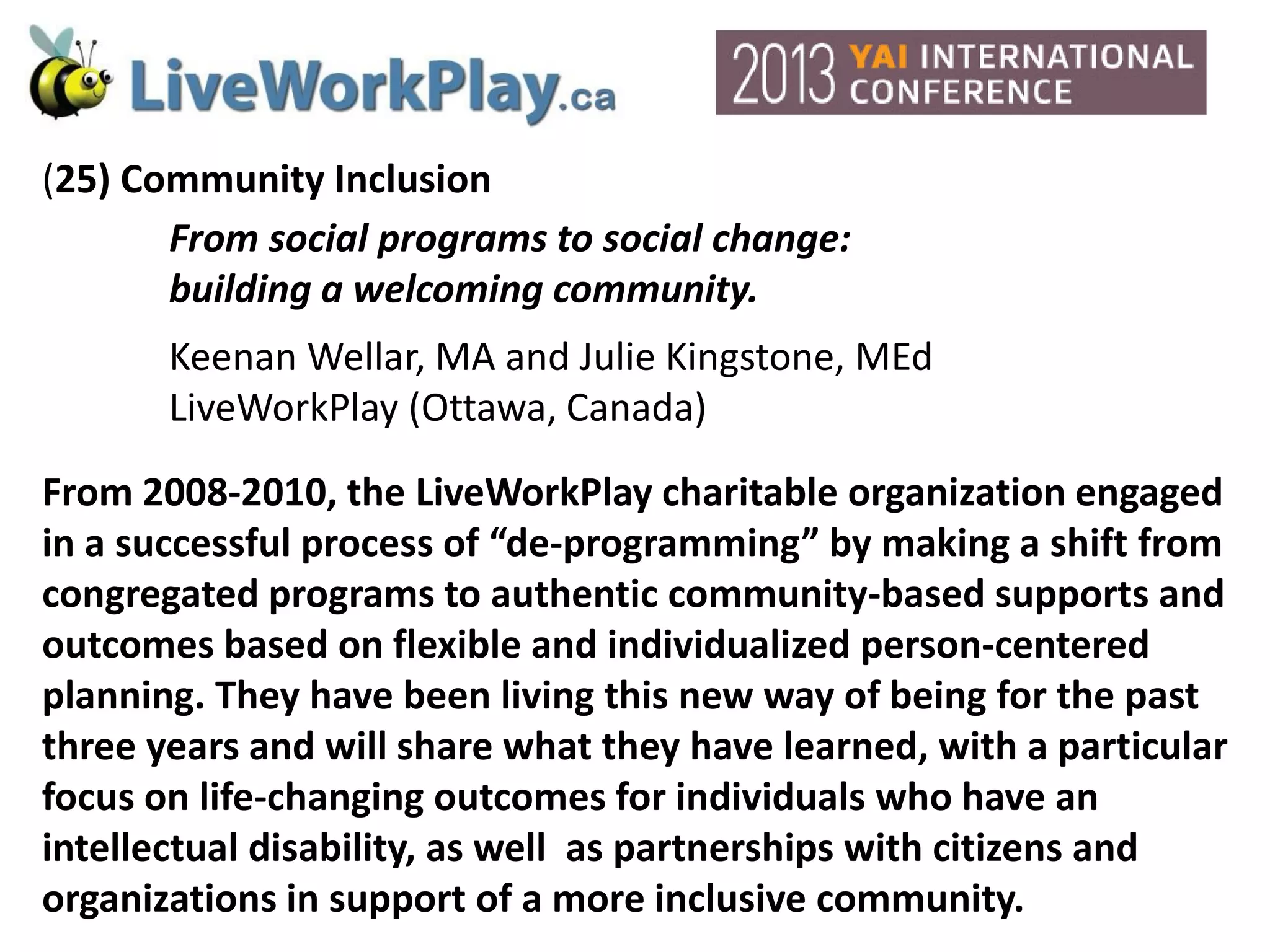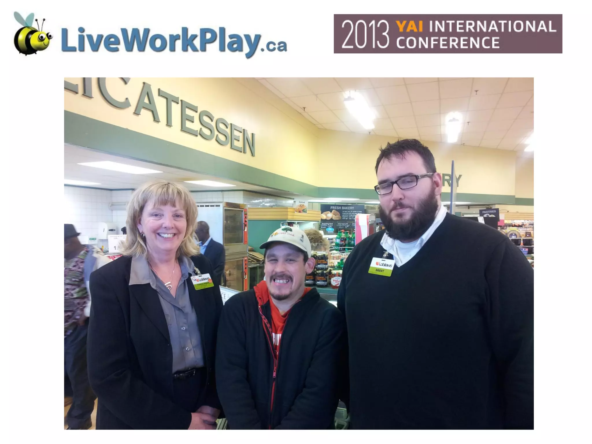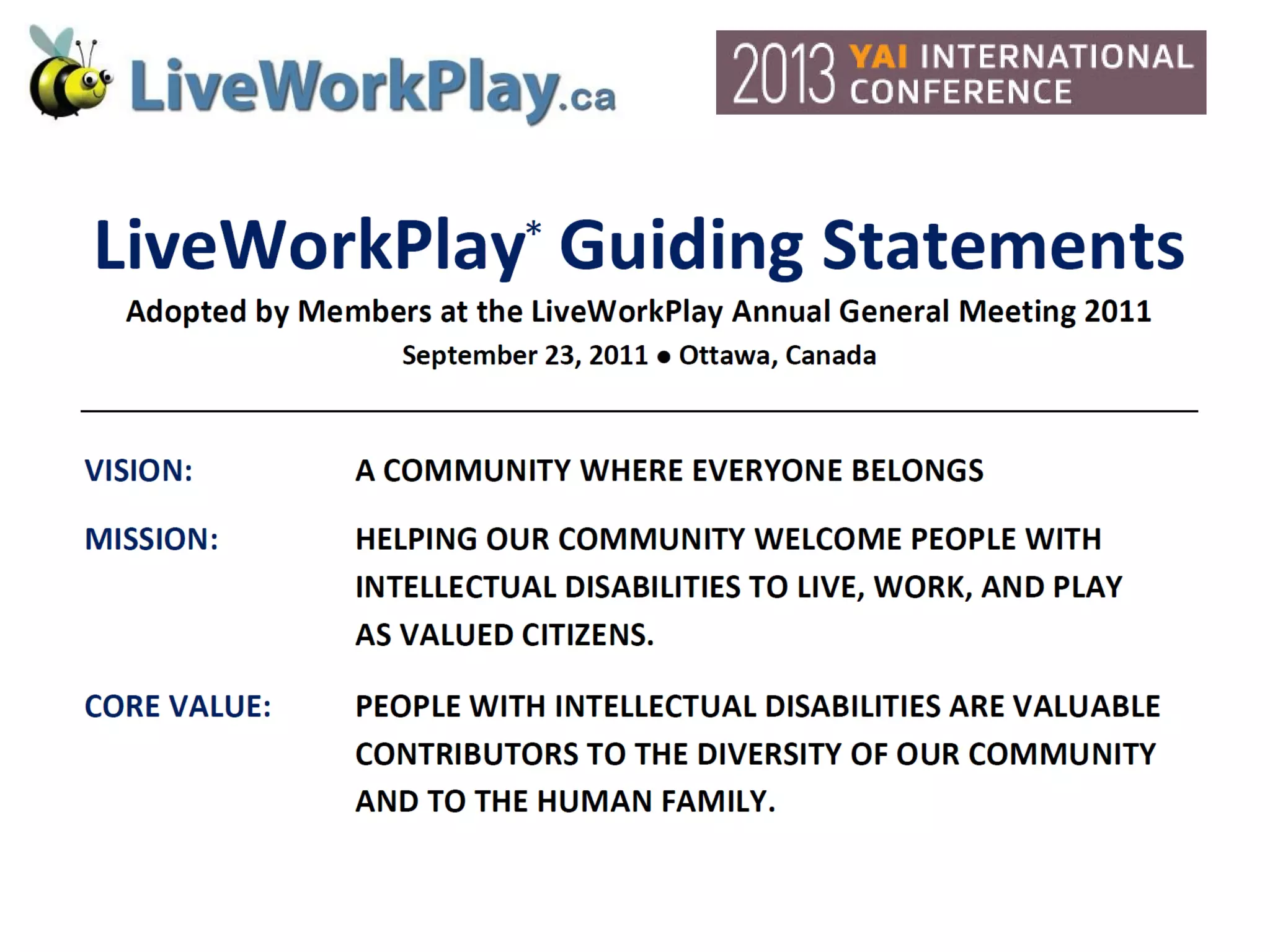 The document outlines the transformation undertaken by LiveWorkPlay in Canada from traditional congregated programs to community-based supports for individuals with intellectual disabilities. It emphasizes the importance of neurodiversity, inclusion, and person-centered planning, highlighting significant improvements in community engagement and individual contributions. The organization aims to foster a welcoming society where all individuals are valued and included in various aspects of community life.