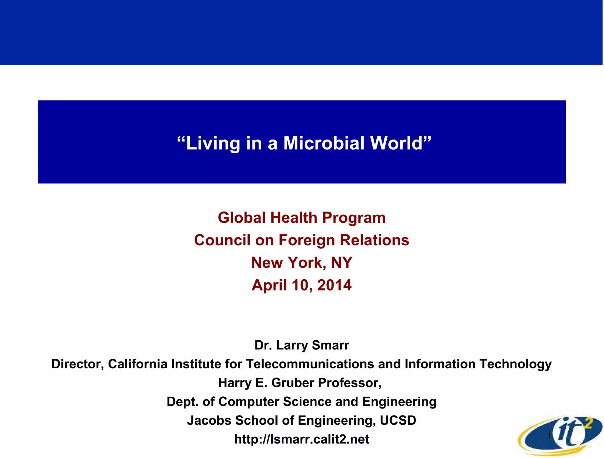 The document discusses the significance of microbial diversity in global health, highlighting the prevalence of microbes within the human body and their environmental impact. It details various research initiatives, especially in metagenomics, aimed at sequencing microbial genomes, analyzing the gut microbiome, and correlating specific microbes with diseases like Crohn's and autism. The author emphasizes the importance of data sharing and advanced computational methods for understanding microbial communities and their health implications.