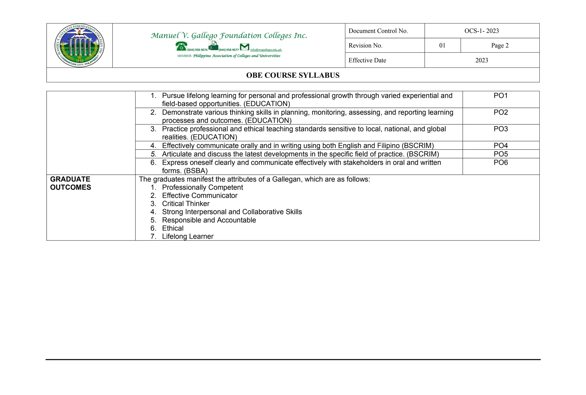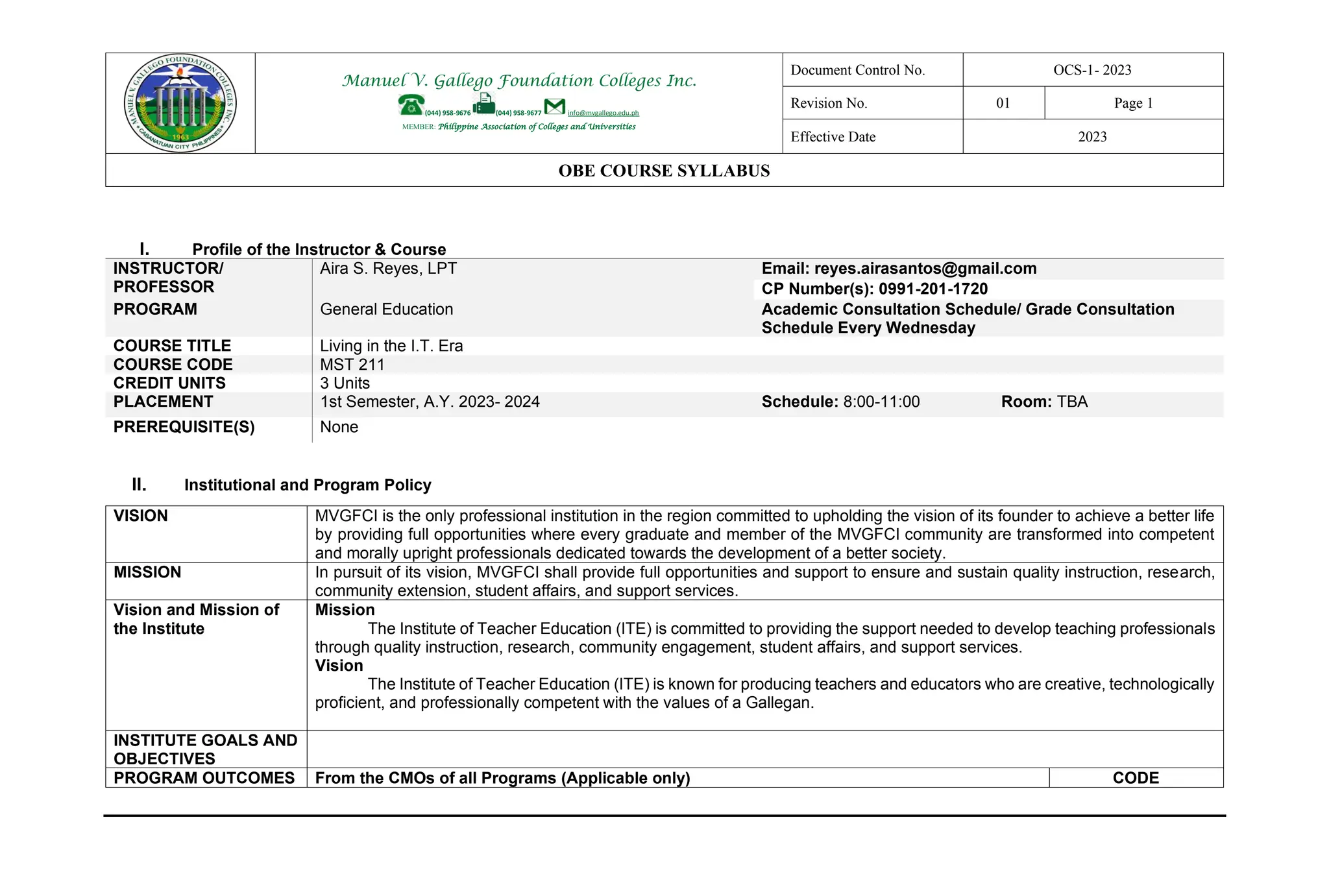 The document outlines the course syllabus for 'Living in the I.T. Era' at Manuel V. Gallego Foundation Colleges, detailing instructor information, course structure, objectives, and evaluation methods. It emphasizes the impact of information technology on modern living and prepares students to analyze digital technologies while practicing ethical decision-making. The course aims to develop critical skills and competencies in students, aligning closely with the institute's vision of fostering competent and responsible professionals.