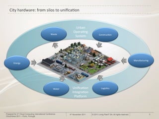 This document discusses using cloud computing and an "Urban Operating System" to improve quality of life in cities. The system would integrate various city systems - like energy, water, waste, manufacturing and more - onto a single unification and integration platform. It describes the key components of this system, including urban cloud appliances, place apps to manage resources at the building scale, and a high-level architecture with modeling, simulation and applications components. The goal is to use this cloud-based system to better manage city infrastructure and resources.