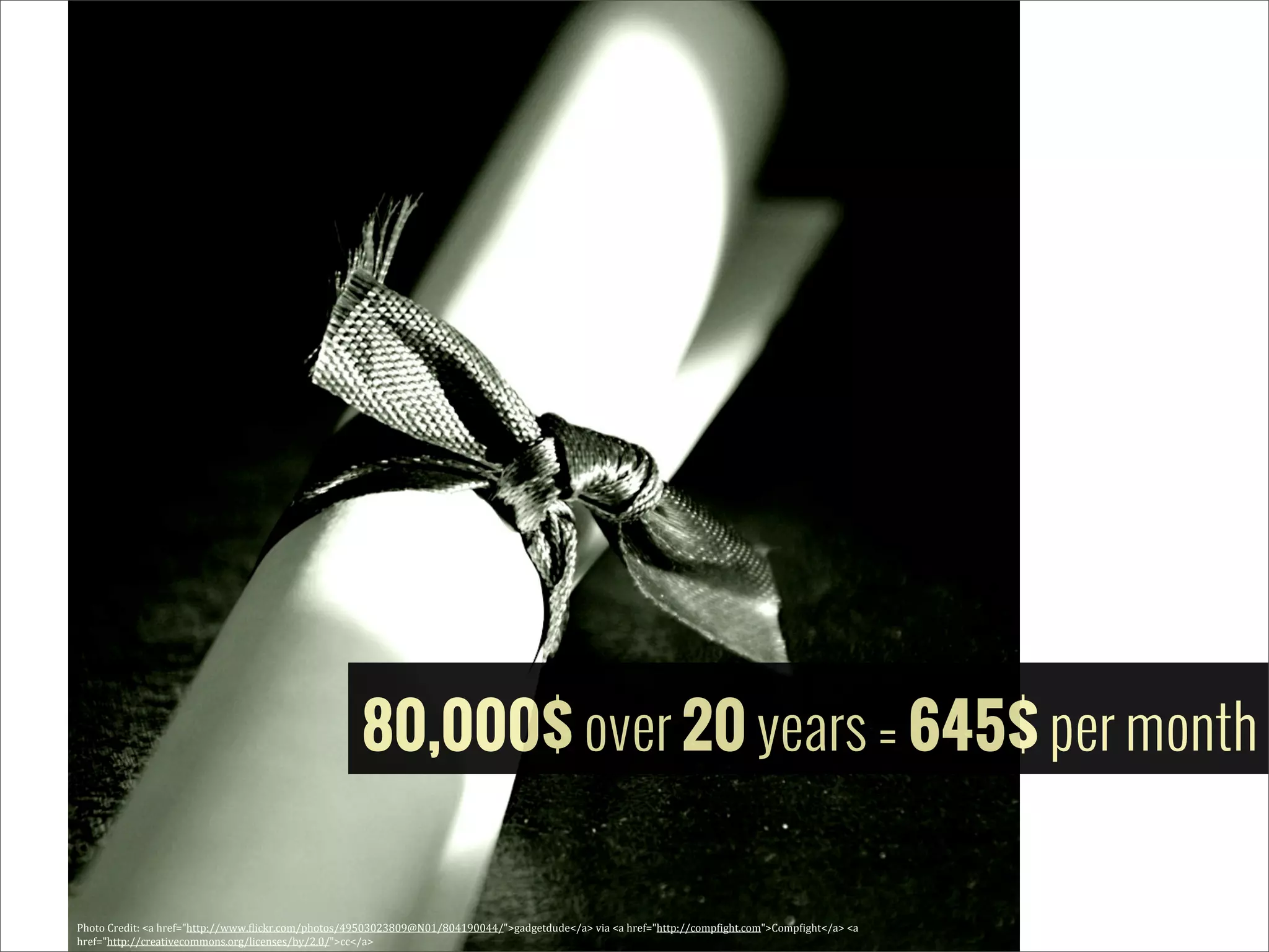 The document discusses paying off $80,000 over 20 years in monthly installments of $645. It encourages developing good financial habits like budgeting, saving money, paying down debt, and preparing for unexpected costs to avoid financial hardship later in life.