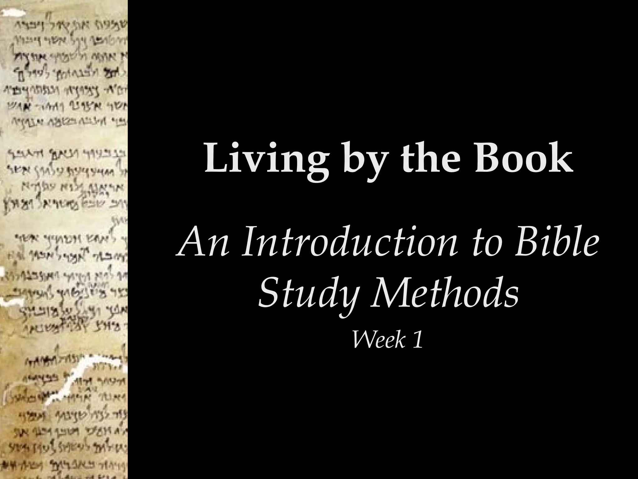 The document outlines a schedule for a Bible study program titled 'Living by the Book,' focusing on different methods of Bible study over several weeks. It discusses various views of the Bible and presents it as a complex collection of writings that contains God's interactions with humanity, along with information on its transmission and translation history. The importance of the Bible is emphasized, highlighting its role in shaping beliefs and guiding personal relationships with God.