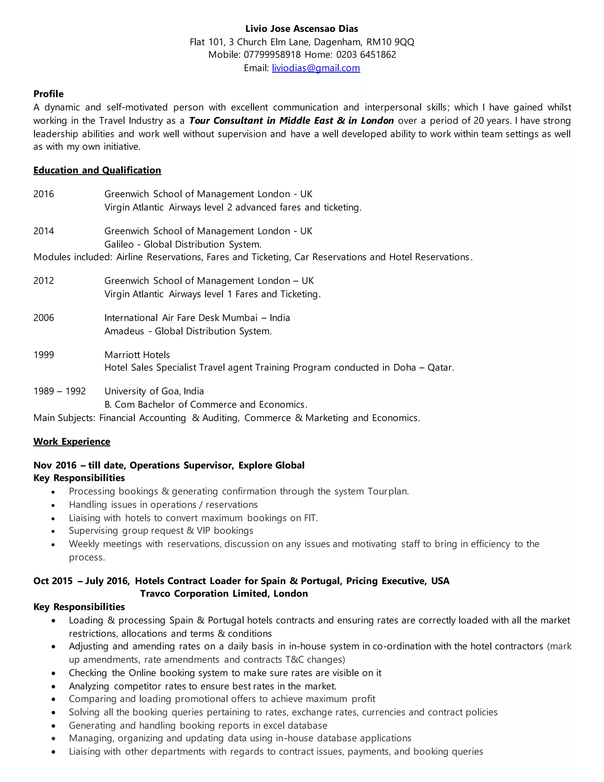Livio Dias has over 20 years of experience in the travel industry working as a tour consultant in the Middle East and London. He has strong leadership, communication, and interpersonal skills. He holds qualifications in airline reservations, ticketing, and global distribution systems. Currently he works as an operations supervisor for Explore Global where he processes bookings, handles issues, and supervises groups. Previously he worked in hotel contracting and pricing roles for Travco Corporation and a reservations coordinator role for Ocean Dusk.