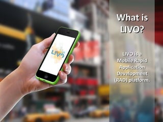 LIVO is a mobile rapid application development (RAD) platform that allows users to create native mobile apps using standard web technologies like HTML5, CSS3, and JavaScript. The platform includes an on-premise control generation engine and web administration interface. Apps created with LIVO can access all native device features while maintaining a flexible web-based user interface. LIVO also enables enterprise integration by securely connecting mobile apps to corporate databases, communication systems, and other backend services. Key advantages of the platform include rapid app deployment, modularity, scalability, and the ability to build apps without requiring mobile developers.