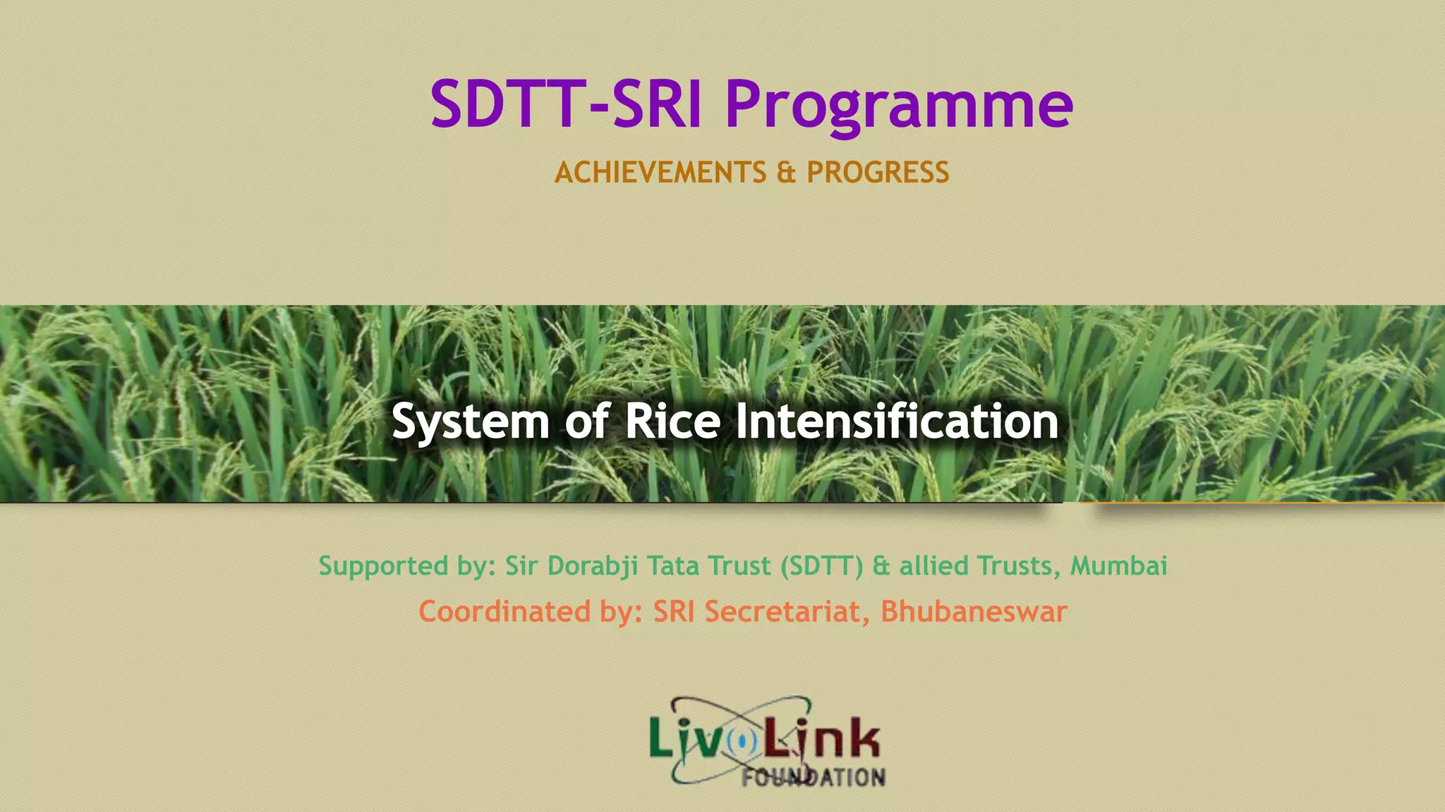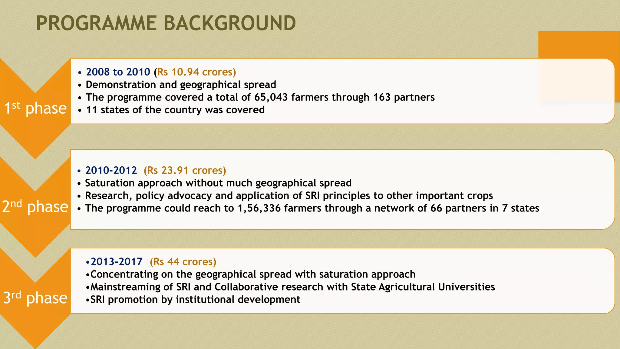 The SDTT-SRI Programme was implemented in 3 phases from 2008-2017 with a total budget of Rs. 78.85 crores. In the first phase from 2008-2010, the programme reached 65,043 farmers across 11 states. In the second phase from 2010-2012, the programme reached 1,56,336 farmers across 7 states using a saturation approach. In the third phase from 2013-2017, the programme focused on geographical spread while also promoting institutional development and collaborative research with state agricultural universities. Key achievements included mainstreaming SRI practices, developing a network of trained experts, and adapting SRI principles to other crops. Monitoring of the programme showed increasing adoption rates, with the number of farmers covered and acreage
