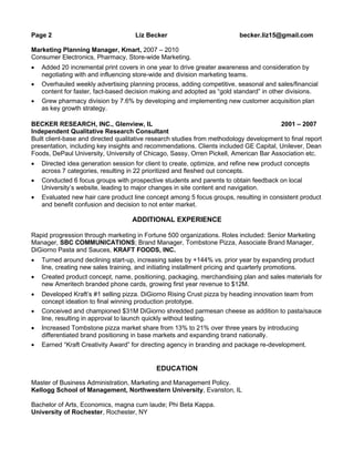 Liz Becker is a strategic B2C marketing leader with over 15 years of experience in marketing planning, new product development, and digital and offline marketing. She has held marketing roles at Barilla, Sears, Kraft Foods, and Ameritech, developing integrated marketing plans, launching new products, and driving business growth. Becker has expertise in consumer insights, market analytics, marketing communications, and leading marketing teams.