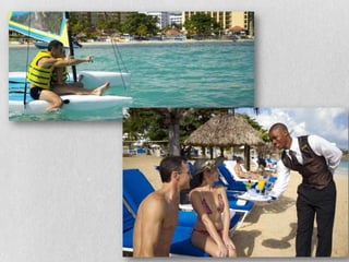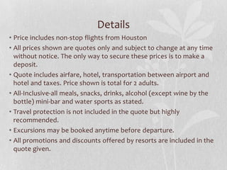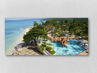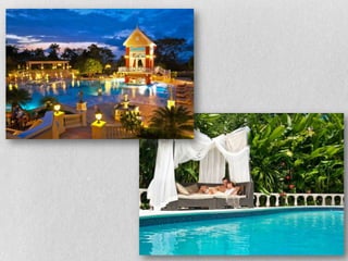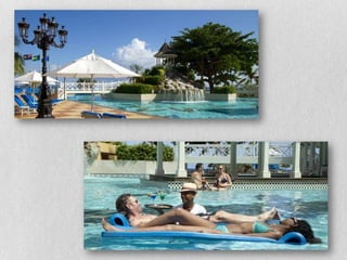 This document provides information on three all-inclusive resort options in Ocho Rios, Jamaica for a vacation from March 23rd-27th. It details the amenities, facilities, dining options, and room rates for the Sandals Grande Riviera Beach & Villa Golf Resort, The Jewel at Dunn's River Beach Resort, and Couples San Souci. The resorts range from 4 to 5 stars and offer oceanview rooms, pools, bars, restaurants, spas, golf, and water sports at all-inclusive rates between $2,800-3,400 for two adults.
